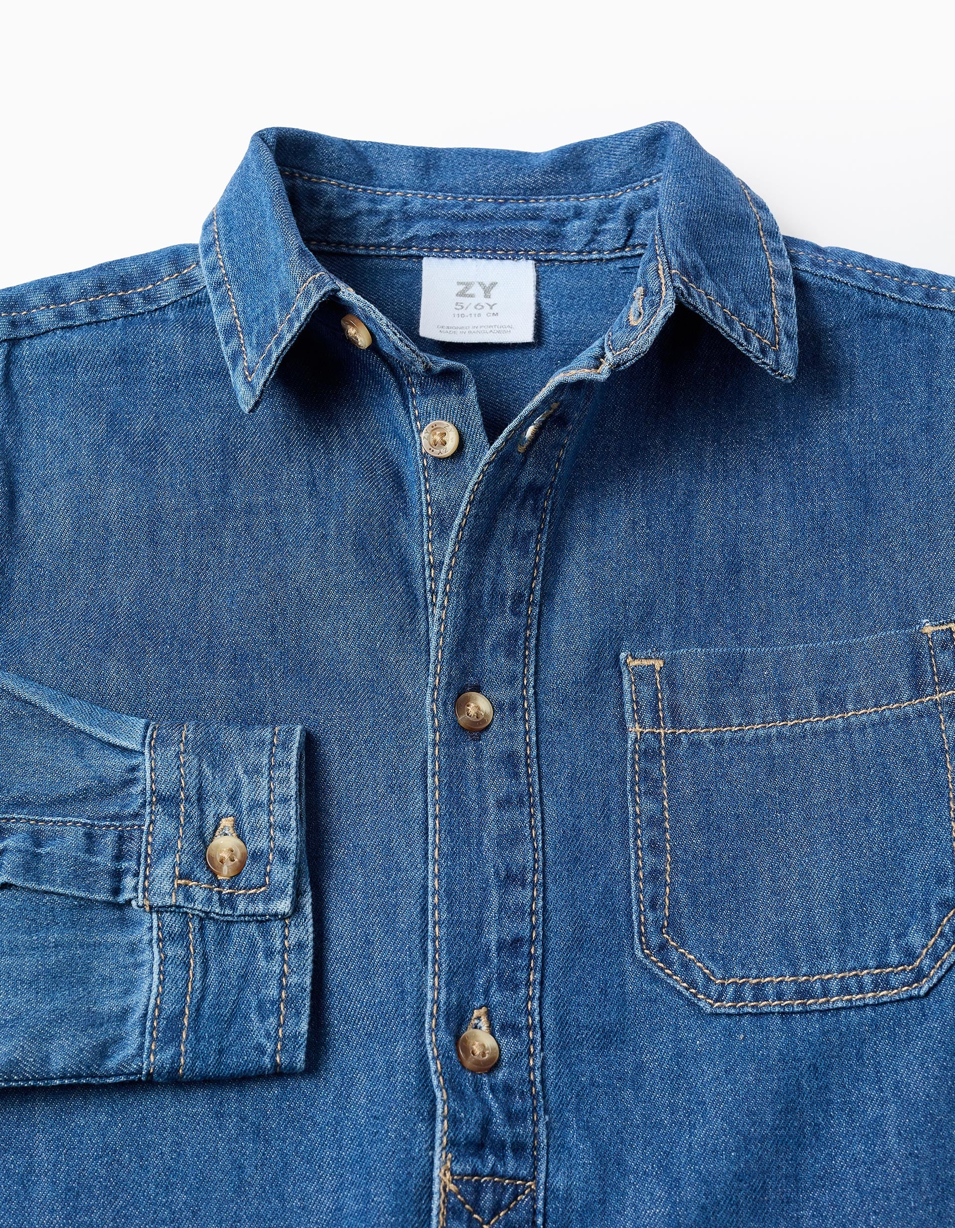 Camisa vaquera azul de manga larga para niño, 100% algodón. Bolsillo en el pecho. Botones visibles en la parte superior y botones ocultos en la parte inferior. Base redondeada. Big Me: botón con hilo y ojal en contraste para que el niño identifique fácilmente dónde empezar a abotonarse, fomentando su autonomía.