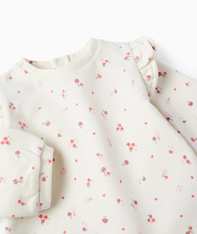 Conjunto de dos piezas para recién nacido, con interior perchado para mayor calidez. Sudadera blanca con motivo de seta y volantes en los hombros, con botones automáticos en la espalda para vestirla fácilmente. Pantalón rosa con cintura elástica y trabillas. Un conjunto práctico y calentito.
