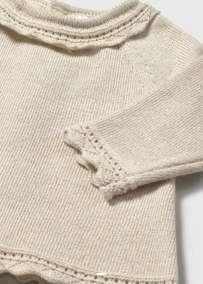 Jersey de manga larga para recién nacida. Cuello redondo con detalles al tono. Cierre con botones en la espalda para facilitar la puesta de la prenda.