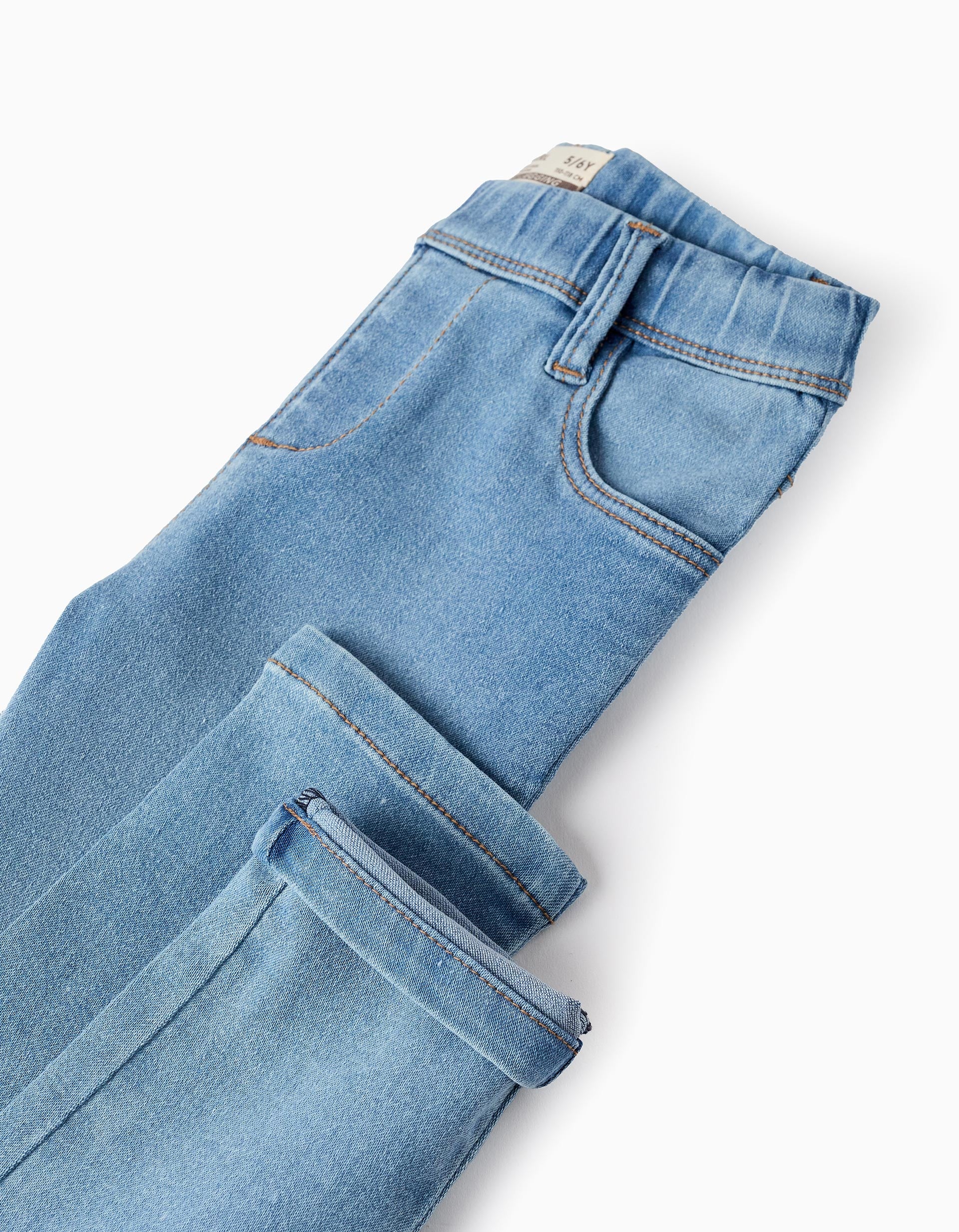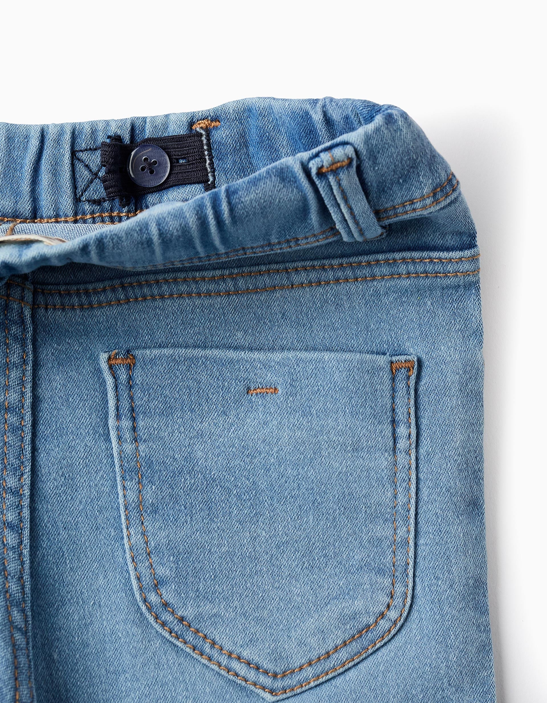 Jeggings azul-claros para niña, de algodón con elasticidad para mayor comodidad y libertad de movimiento. Cintura elástica y cómoda, ajustable en el interior con elásticos y botones. Cuatro bolsillos. Una opción perfecta para el día a día.
