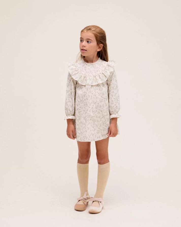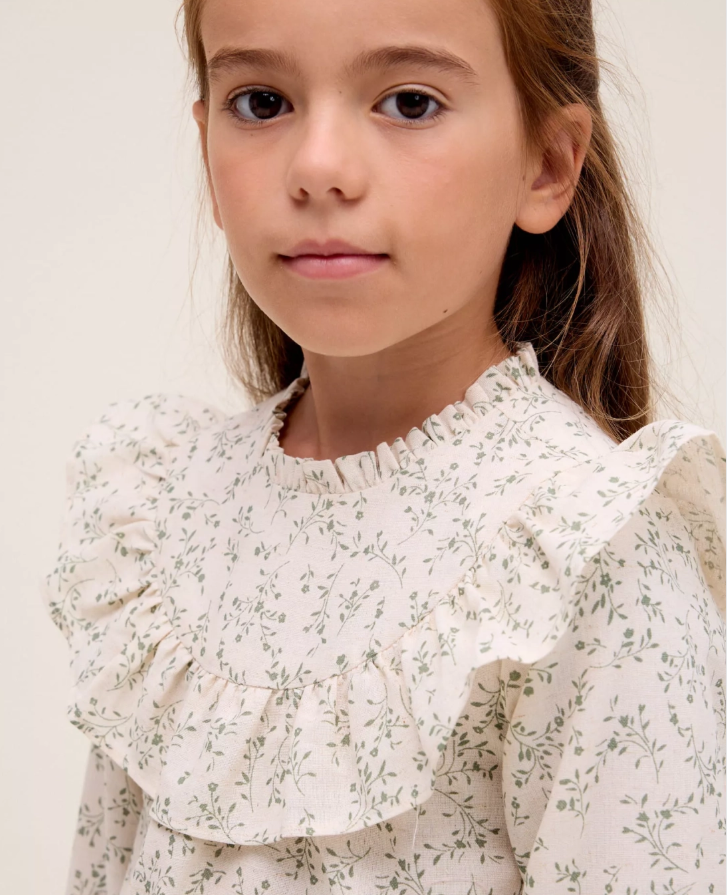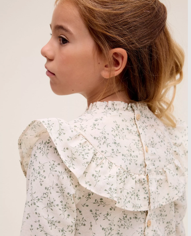 Vestido de niña evasé crudo con estampado floral verde, manga larga, cuello fruncido, volante en parte delantera y espalda, puño elástico y cierre trasero.